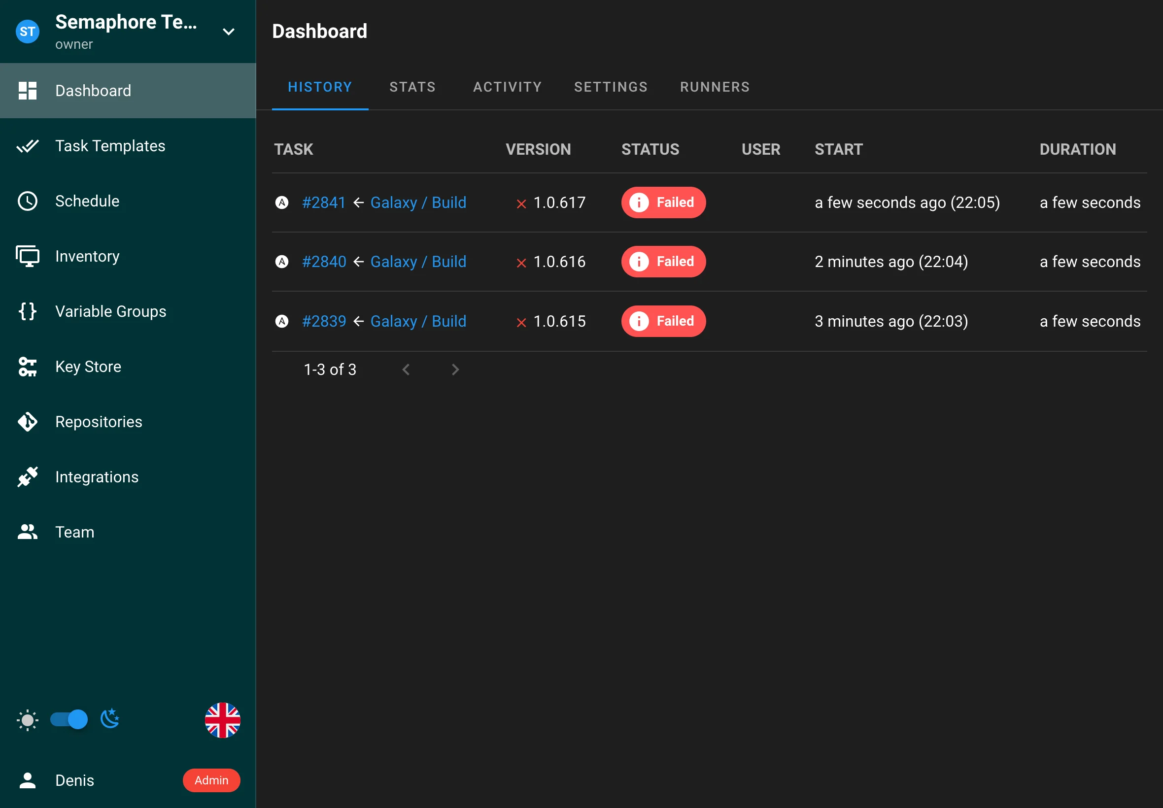 The History screen in Semaphore provides a comprehensive view of all task executions within your project. This feature allows you to track, analyze the execution history of your tasks, providing valuable insights into your automation workflows.