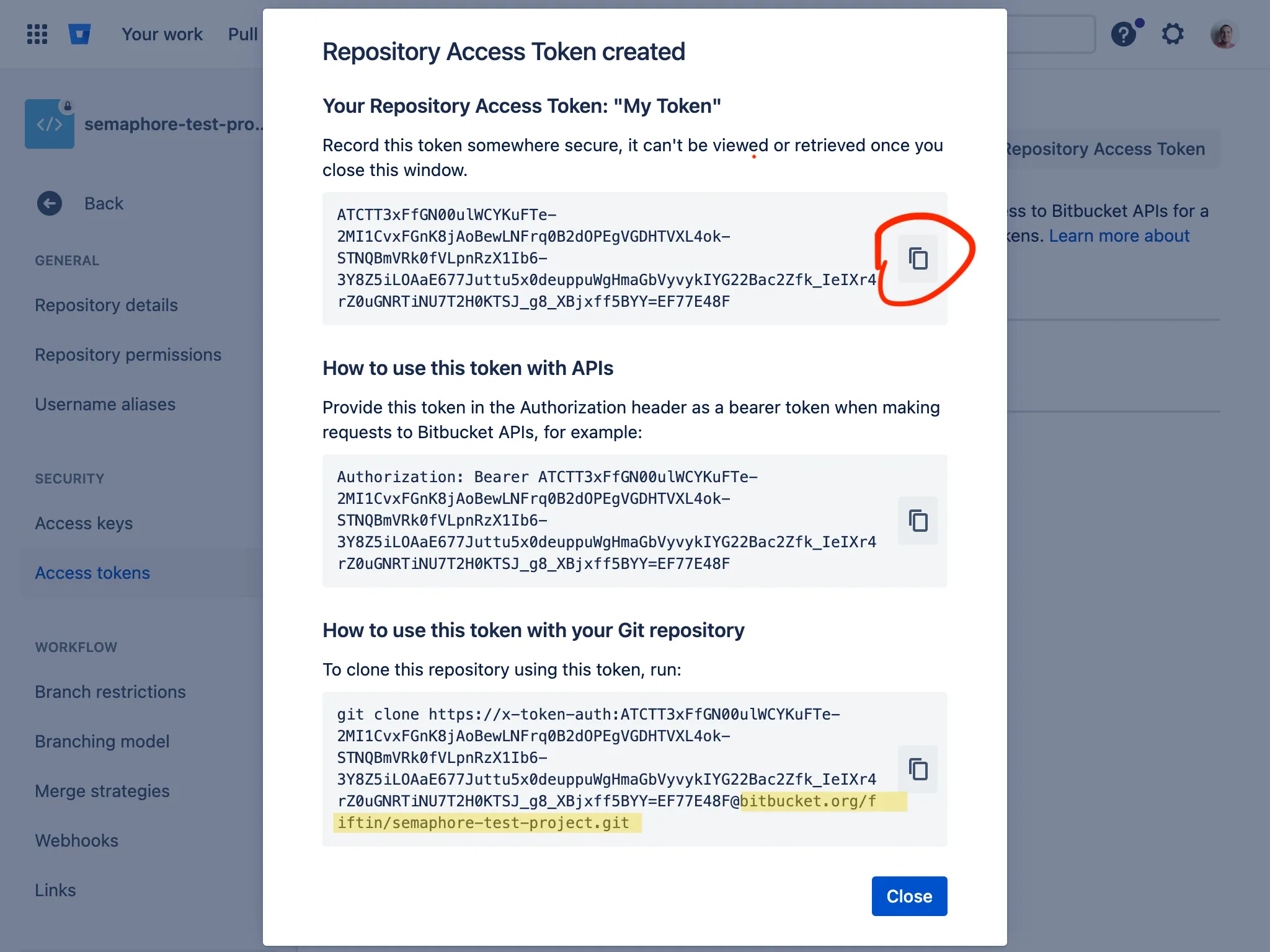 After creation, you will see the access token. Copy it to your clipboard as it will be required for creating an Access Key in Semaphore.