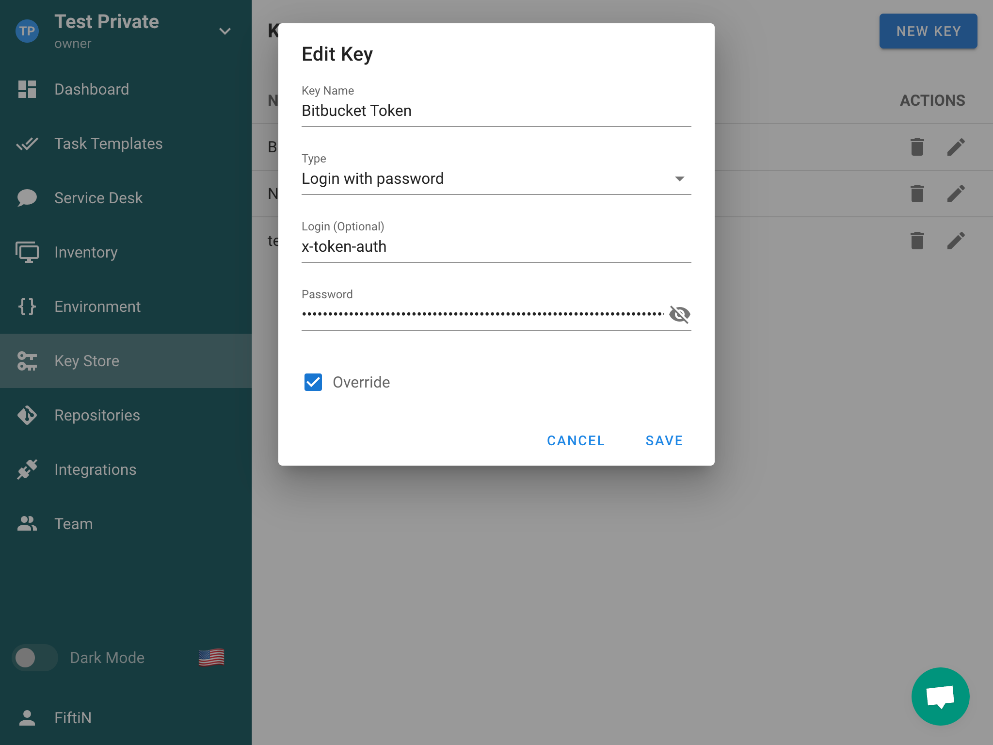 - Go to to the Key Store section in Semaphore and click the New Key button.