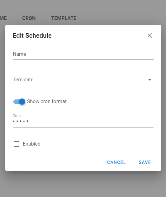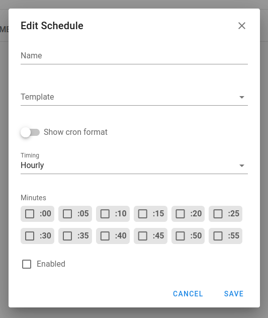 | Timing | Either in cron format for more fexibility or using the built-in options for common intervals |